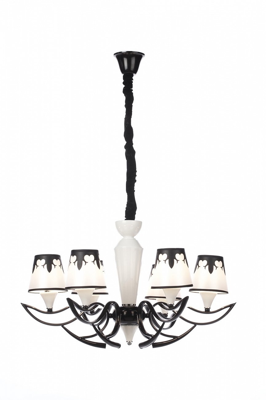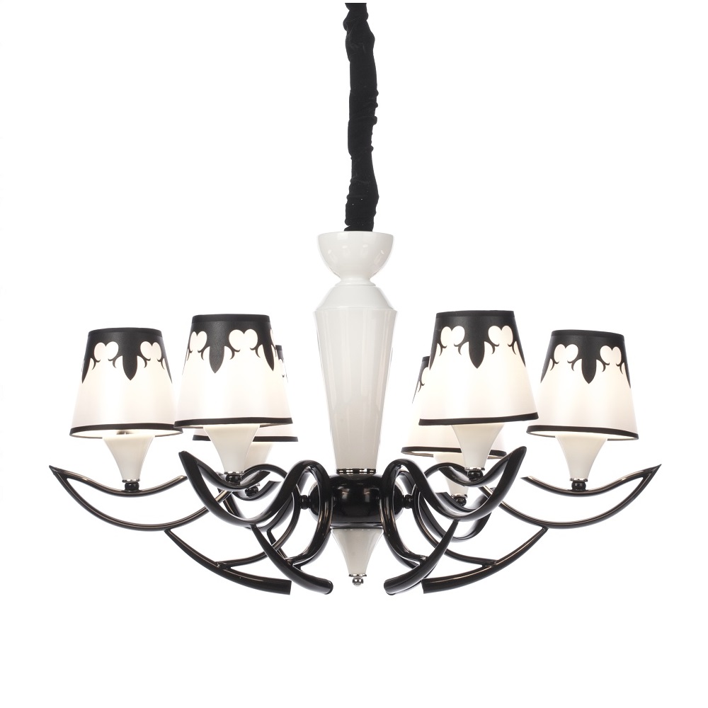 Люстра Atlantic. Люстра Atlantic выполнена в строгой классической монохромной цветовой гамме. Она имеет чёрный металлический каркас, в центре расположен белый декоративный элемент из керамики, от которого в стороны симметрично расходятся «ветки» с шестью тканевыми абажурами. Абажуры имеют красивую чёрно-белую роспись. Люстра смотрится роскошно, но в то же время она не перегружена декоративными элементами, поэтому понравится и ценителям минимализма. Длина провода 30 см.