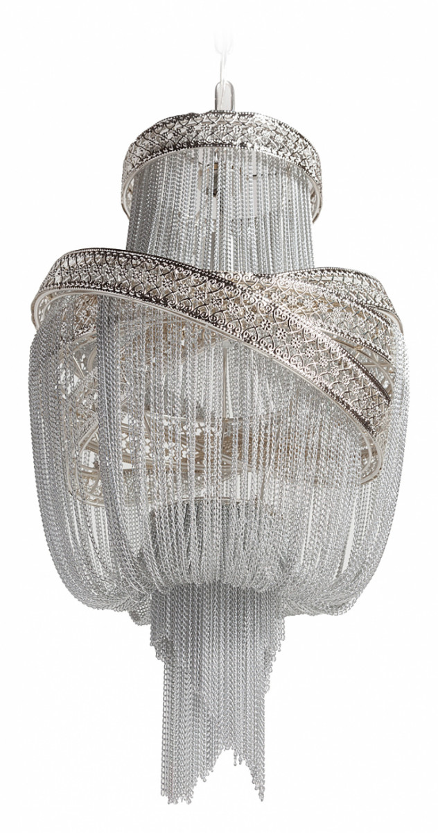Люстра Guadarta Largento Серебро. Роскошная люстра GUADARTA LARGENTO Серебро из множества металлических цепочек, напоминающая своим исполнением эффектный предмет декора. Сложно оторвать взгляд от такого безупречного предмета интерьера. В люстре удачно сливаются воедино эффектная асимметрия, объемная форма, динамика и чистое серебристое сияние. Множество металлических цепочек хорошо пропускают свет, она станет отличным источником освещения небольших помещений. Длина провода 80 см. Предназначена для использования со светодиодными лампами.