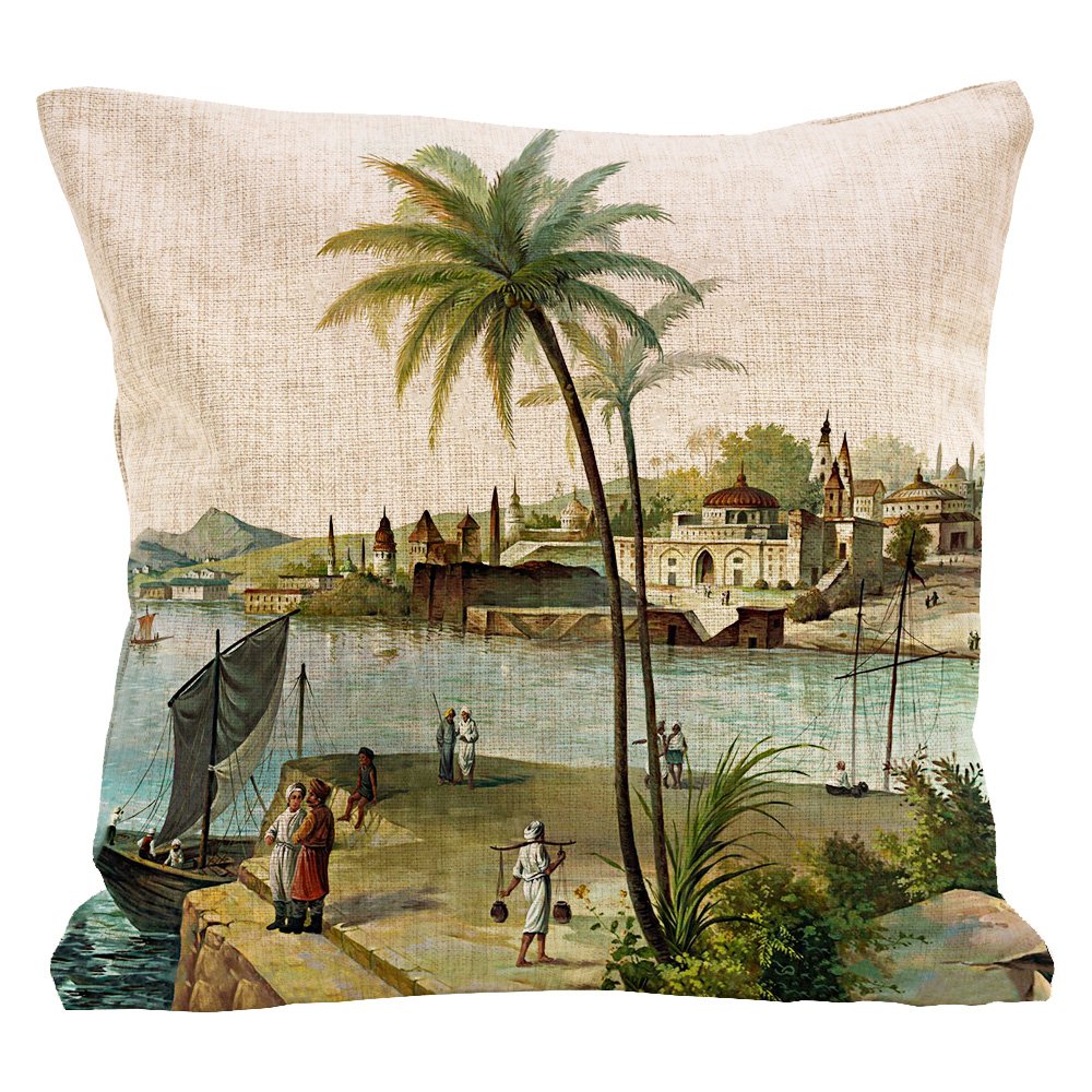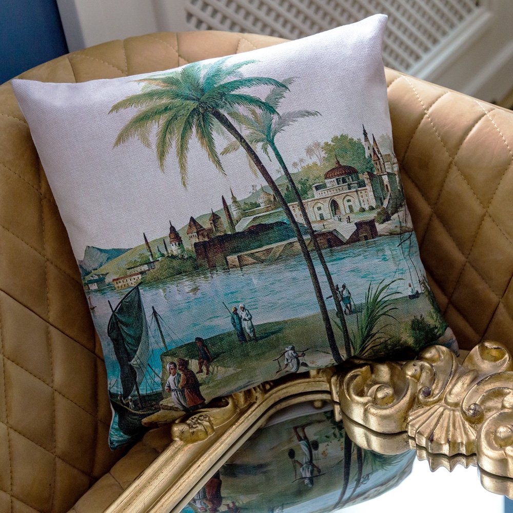 Бенарес - город, буквально расположенный меж двух рек. Это святой город, имеющий для индусов такое же значение, как Ватикан для католиков. В конце XVIII и начале XIX веков многие художники–пейзажисты отправлялись в путешествия по Индии, чтобы запечатлеть красоту этого прекрасного далекого мира. Это увлечение переросло в настоящий интерьерный бум. Художники создавали свои работы, нанося их на панорамные обои, тем самым окутывая домашнюю атмосферу сценами и повествованиями экзотических мест. Мягкая натуральная ткань, воздушный наполнитель, увлекательный пейзаж, - декоративные подушки «byObject» откликаются на любые условия эргономичного отдыха. Рассматривая подушку «Бенарес», обратите внимание на одноименный мягкий диван и обширную галерею романтичных этнических репродукций. Столь пышное соцветие уверенно гарантирует Вам комфортабельную и стильную лаунж-зону.